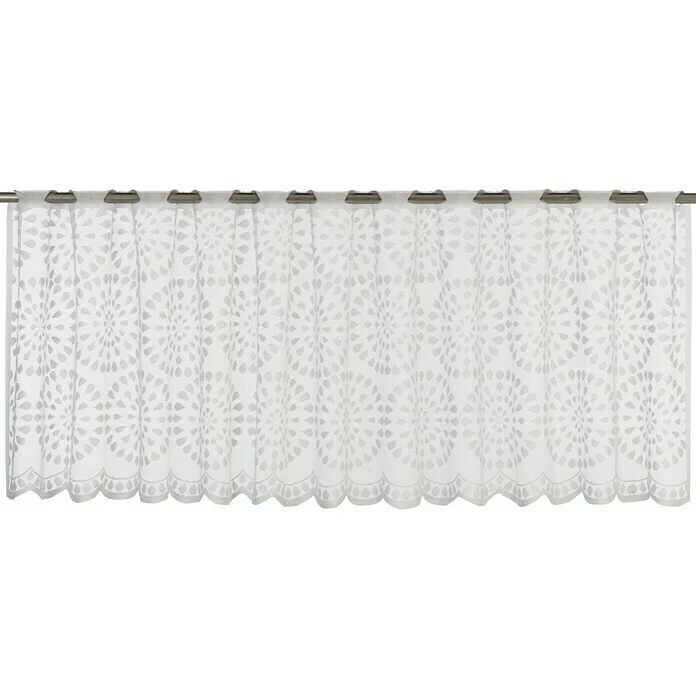 Die Elbersdrucke Bistrogardine Circolo ist eine transparente Scheibengardine aus Raschelware. Diese hübsche Kaffeehausgardine mit graphischen Kreis-Motiven in Spitzen-Optik ist ein Klassiker und besonders gut geeignet für Küchenfenster. Das schöne Panneau mit gewebter Ösen-Aufhängung bietet einen leichten Sichtschutz: Der untere Teil des Fensters wird verdeckt und hält neugierige Blicke fern, darüber lässt sich der Ausblick genießen.
