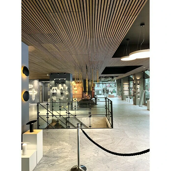 Die FibroTech Akustikpaneele eröffnen völlig neue Gestaltungsmöglichkeiten für Decken und Wände. Zur Ruhe kommen und Schallgeräusche in den eigenen vier Wänden reduzieren. Die schallabsorbierende FibroTech Akustikpaneele wandelt Schallenergie in thermische Energie um, absorbiert diese und streut den reflektierten Klang. Das Paneel schwächt besonders hohe und mittlere Frequenzen ab und wandelt diese in ein qualitativ hochwertiges und sauberes Klangbild. FibroTech verleiht den Räumen ein natürliches, modernes und doch zeitloses Ambiente. Das Raumklima verbessert sich spürbar. Die Akustikpaneele können als Designelement bereits bei der Raumplanung berücksichtigt oder komplette Wände und Decken damit ausgestattet werden (nicht für Feuchträume geeignet). Auch für den Ladenbau, Büros, Produktionsstätten, Aufnahmestudios, Heimkinos, Musikräume, Hörsäle, Proberäume und Konferenzräume sind die Produkte von FibroTech bestens geeignet. Die Montage ist sehr leicht – es werden keine besonderen Vorkenntnisse benötigt, um ein perfektes Ergebnis zu erzielen. Das Trägermaterial besteht aus recyceltem Kunststoff, die Designstreifen aus Hölzern (MDF und edle Echtholzfurniere), welche aus nachhaltiger Forstwirtschaft stammen. Das Produkt ist mit dem FSC® Zertifikat ausgezeichnet. Hinweis: Echtholzfurniere können je Charge voneinander farblich abweichen. Je nach Lichteinfall können die Paneele unterschiedlich die Farbgebung verändern, dies ist naturgegeben und kein Reklamationsgrund. Das MDF-Trägermaterial kann Farbabweichungen aufweisen.