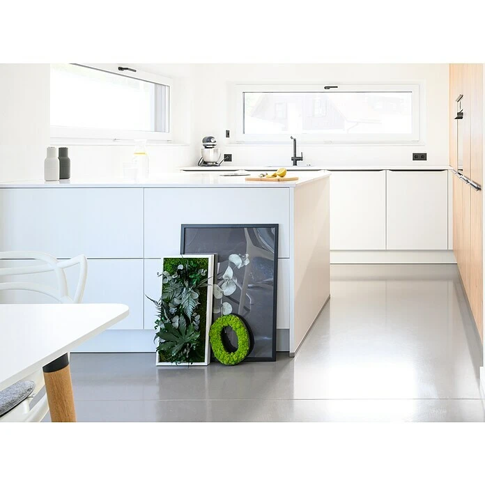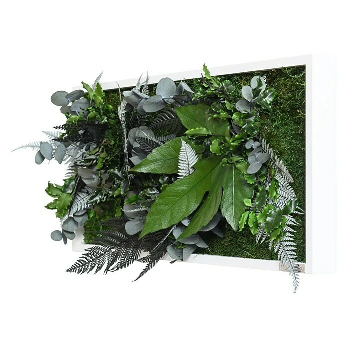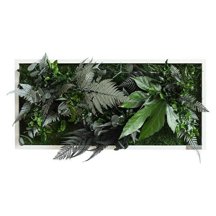 Es besteht aus einem hochwertigen, weißen, FSC®-zertifizierten Vollholz–Rahmen, welcher mit verschiedenen Moos- und Pflanzenarten begrünt ist. Das Besondere an diesem es ist die dreidimensionale Anordnung von tropischen Akzentpflanzen, welche in Kombination mit den heimischen Moosen ein wunderschönes Gesamtbild ergibt. Da die Moose echt sind und zu 100 % natürlich konserviert sind, kann das Moosbild nur in Innenräumen aufgehängt werden. Die Pflanzen benötigen aufgrund der hochwertigen Konservierung keine Pflege und sind viele Jahre haltbar. Der Rahmen besitzt an der Rückseite Ösen zur Wandmontage. Dadurch kann das Wandobjekt sowohl vertikal als auch horizontal montiert werden.
