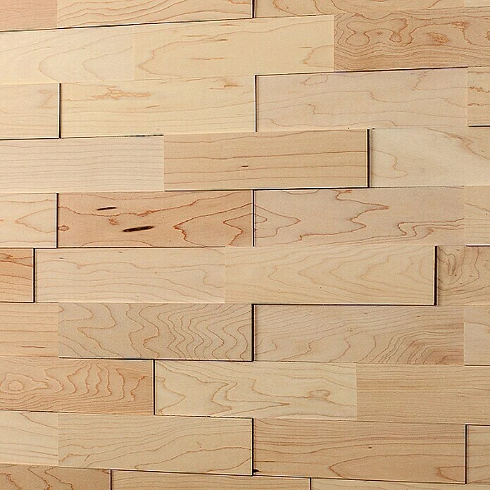Die Wodewa Echtholzriemchen aus Ahorn bieten jede Menge Möglichkeiten für die individuelle Innenraumgestaltung mit Holz. Mit der 3D-Holzdekoration gelingt es schnell und einfach Zimmerwände zu gestalten. Die Anwendung ist sowohl für große Flächen als auch kleine Akzente geeignet. Das Anbringen der Massivholzwandverkleidung ist auf allen tragfähigen, glatten und festen Untergründen möglich. Eine optimale Tiefenimprägnierung durch modernste Fertigungstechnik mit mehrmaligem Auftrag gewährleistet einen zuverlässigen Oberflächenschutz vor Feuchtigkeit und Verschmutzung. Die Wodewa Holzwandverkleidung kann mit einem weichen feuchten Tuch, einem Staubwedel oder durch Absaugen einfach gereinigt werden. Dank der drei verschiedenen Materialstärken entsteht eine außergewöhnliche 3D-Optik. Die freie Verlegung garantiert ein Unikat als Fläche. Natürliche Wuchsmerkmale und Farbabweichungen sind ein Beweis dafür, dass es sich um echtes Holz handelt.