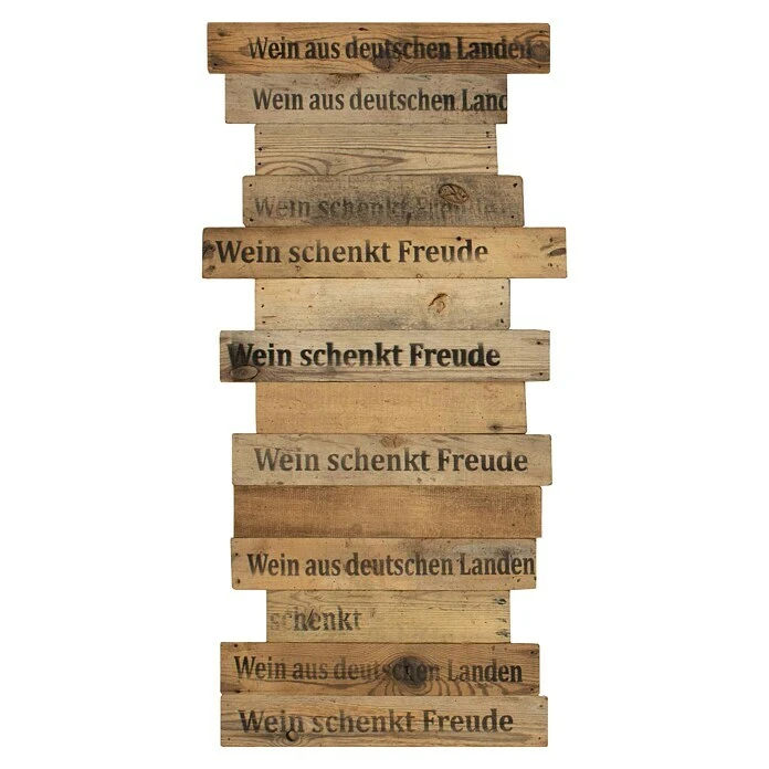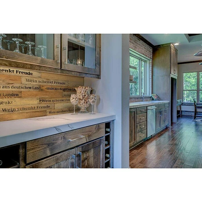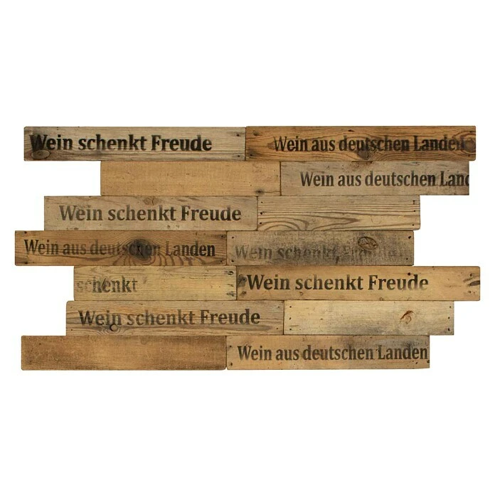 Die Wodewa Echtholzriemchen im Weinkisten Design entsprechen dem Design alter nostalgischer Weinkisten, die in Deutschland im Einsatz waren. Wein, als Produkt höchstqualitativen Handwerks in Verbindung mit den aufwendig produzierten Echtholzpaneelen von Wodewa, schafft eine Wandverkleidung voller Tradition und Geschichte. Die Holzwandverkleidung passt perfekt zu klassischen Einrichtungsstilen wie Retro, Landhaus oder Vintage. Die originalen Schriftzüge “Wein schenkt Freude” und “Wein aus deutschen Ländern” erzeugen einen einmaligen Charakter und eine gemütliche Atmosphäre. Auch im gewerblichen Bereich, insbesondere in der Gastronomie, wertet die Wodewa Wandverkleidung das Ambiente geschickt auf.