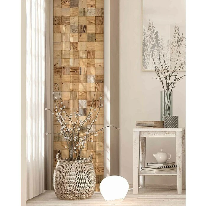 Das Wodewa Holzmosaik Original Altholz bietet Recycling in seiner schönsten Form. Anstatt altes Kiefernholz zu vernichten, wird dieses aufbereitet, getrocknet und anschließend zu Wandriemchen weiterverarbeitet. Das Kiefern-Altholz hat einen einmalig unverkennbaren Farbton, der durch sein Alter und unterschiedlichen Witterungsbedingungen entsteht. Verfärbungen, markante Maserungen und strukturierten Oberflächen bis in den Tiefengrund unterstreichen das Alter und somit die Wertigkeit des Altholzes. Jedes einzelne Holzmosaik wird auf eine selbstklebende Matte, sauber und sicher verklebt. Dabei werden 9 einzelnen Holzmosaike zu einer Matte verklebt. Für den einzigartigen 3D Effekt jeder Matte sorgen die unterschiedlichen Stärken von 3 und 6 mm. Ohne weitere zusätzliche Materialien wie Schrauben, Kleber oder Nägel erfolgt die Montage schnell und einfach. Jede einzelne Mosaikmatte ist durch die natürlichen Farb- und Strukturunterschiede und die aufwendige handverlese Verarbeitung der einzelnen Holzmosaike ein Unikat.